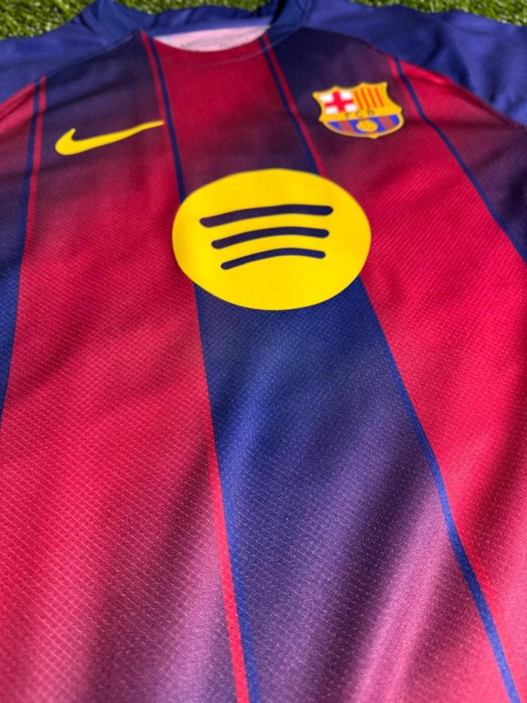 الطقم الأساسي لبرشلونة 2025/2026 يعود إلى جذوره بتصميم كلاسيكي بخطوط البلوغرانا المميزة، وشعار النادي مطرز بجودة عالية. مصنوع من خامات مريحة وتقنيات تهوية متقدمة من Nike، مثالي للتشجيع والرياضة.