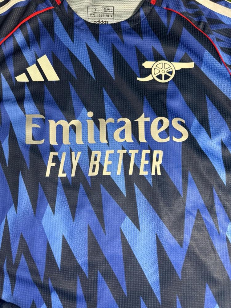 • شعار أرسنال مطبوع، مع الراعي “Emirates Fly Better” مطبوع بدقة.